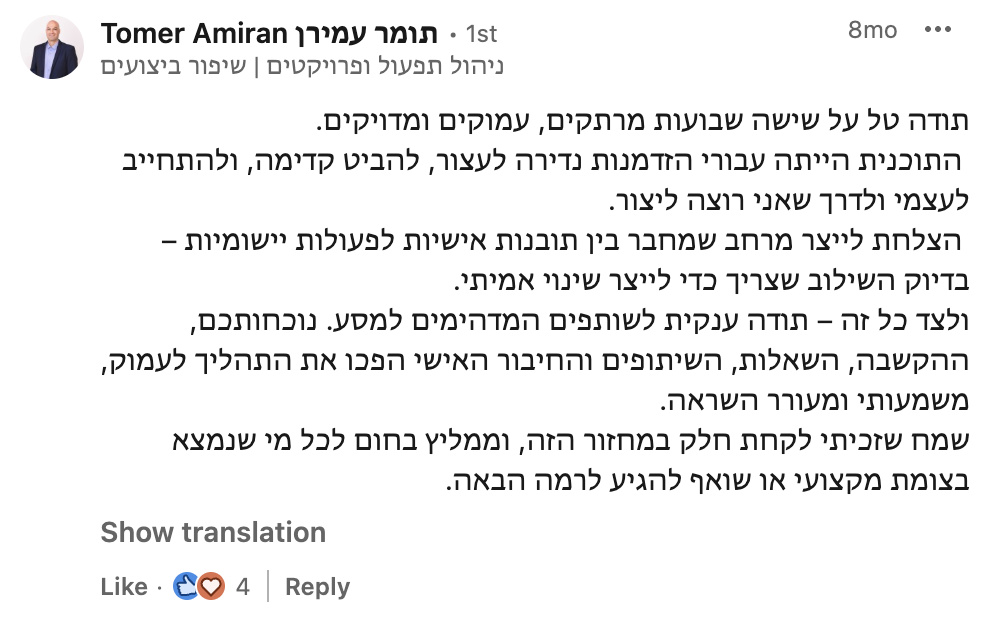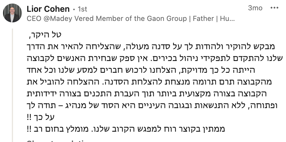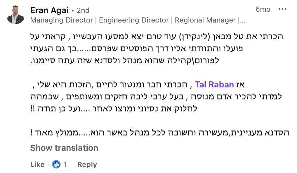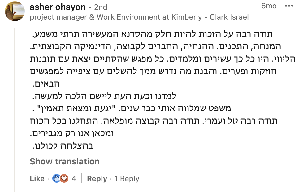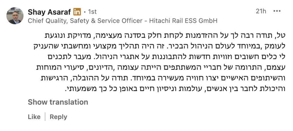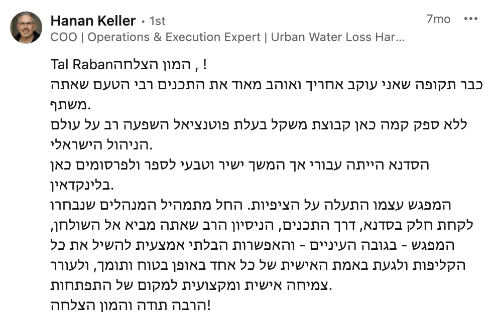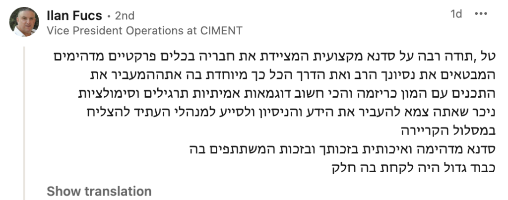את הלמידה המשמעותית שרכשתי לאורך שנות הקריירה איגדתי בספר "הדרך להיות מנכ"ל" ואני מיישם כעת מול מנהלים מדרגים שונים מדרג הביניים דרך מנהלי חטיבות ומנכ"לים. אני מאמין שלמידה והכרות עם האתגרים ואפשרויות הפתרון לפני שכל אחד נאלץ לפגוש אותם במסלול הקריירה שלו, יכולים לקצר משמעותית את הדרך לתפקידים בכירים ולבסוף לכסא המנכ"ל ומכאן הייעוד החדש שלי – לתת ערך למנהלים שמבקשים לצעוד "בדרך להיות מנכ"ל"