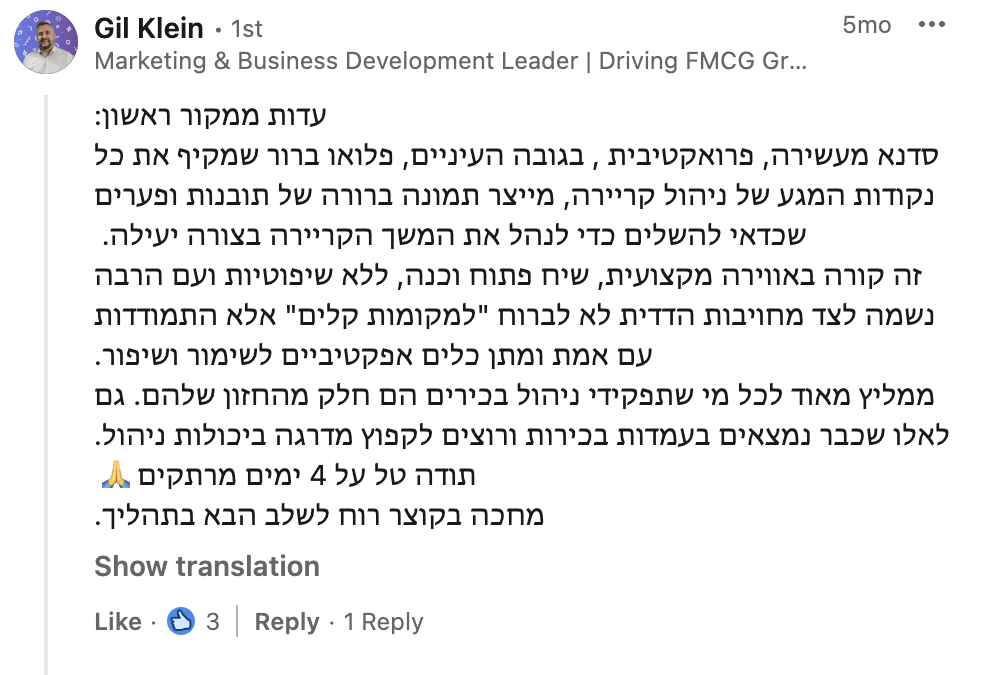 הקריירה העסקית שלי התחילה לפני יותר מ-30 שנה לאחר שירות כקצין וחובל על ספינת טילים. ב- 14 השנים האחרונות היתה לי הזכות להיות מנכ"ל של 3 ארגונים מהגדולים והמשמעותיים בישראל – קוקה-קולה ישראל, מחלבות טרה וקימברלי קלארק. במשך השנים הללו הבנתי את מערכת ההפעלה הארגונית, את משמעות המנהיגות ואתגרי הניהול וחשוב מכל יצרתי יחד עם קבוצת המנהלים שלצידי הצלחות עסקיות בתקופה של התמודדות מול סביבה משתנה, תחרות אגרסיבית ואתגרים גלובליים ומקומיים.